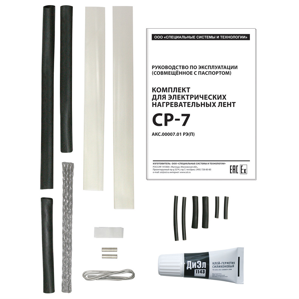 Комплект СР-7 включает в себя термоусаживаемые трубки на основе фторполимера, припой, медную луженую плетенку, фторопластовую ленту и клей-герметик.