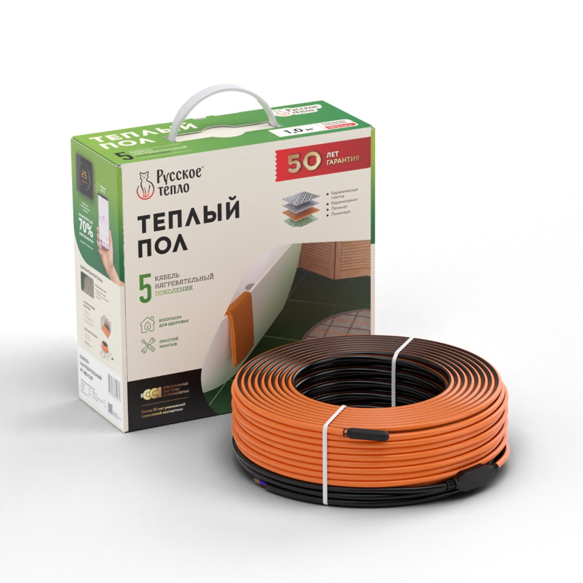 Теплый пол «Русское Тепло» на основе нагревательного кабеля может применяться как для основного, так и для комфортного обогрева помещения, устанавливается в слой песчано-цементной стяжки 3-5 см под любое напольное покрытие: ламинат, линолеум, керамическая плитка, керамогранита.