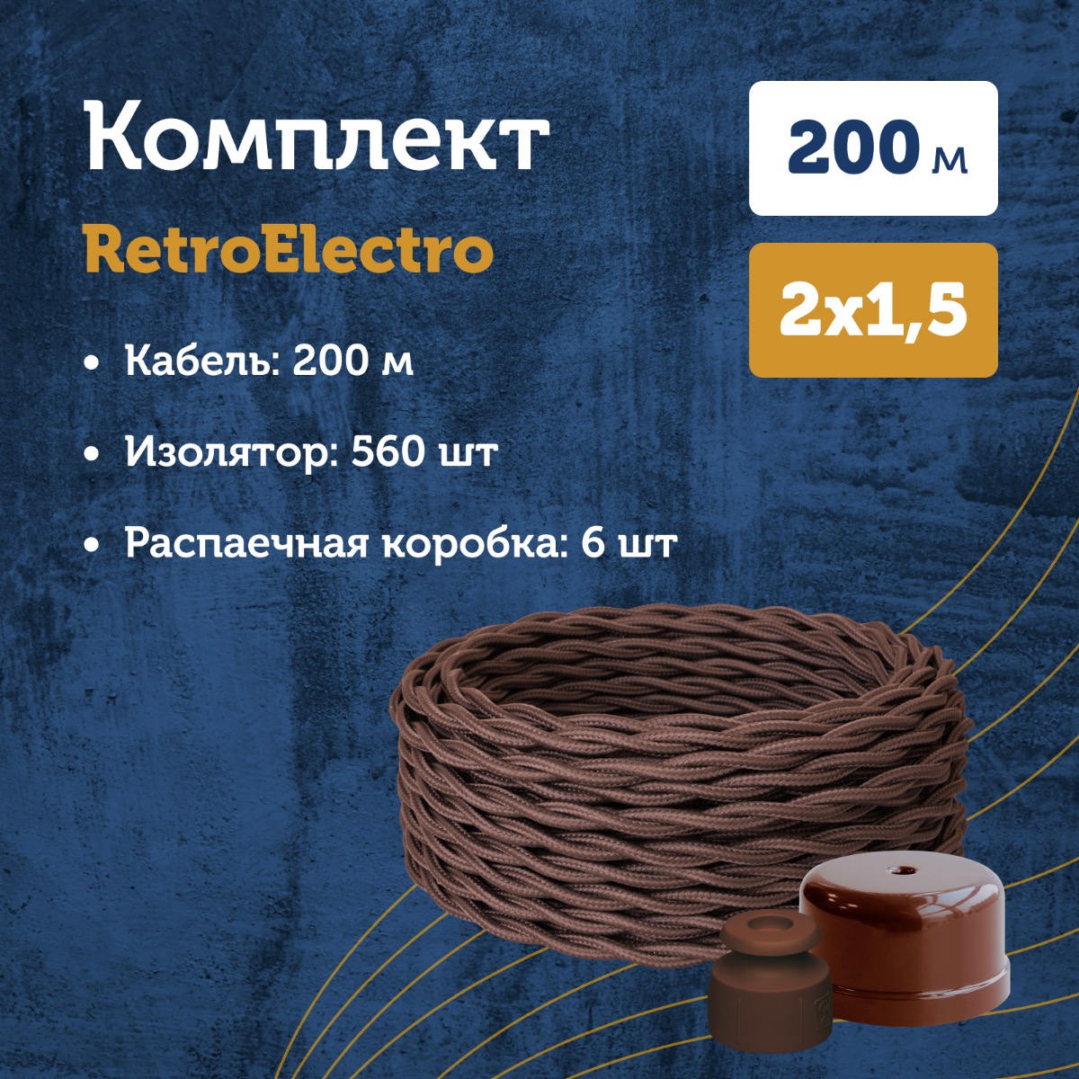 Комплект. Провод RE, коричневый 2х1,5 -200 м,,0 м, Изолятор RE, - 560 шт, Распаечная коробка RE, -6 шт