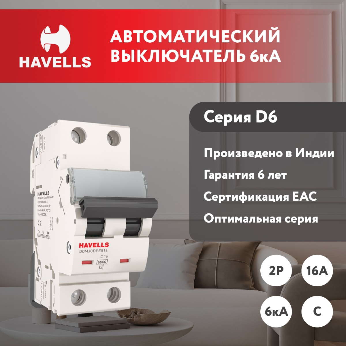 Автоматические выключатели предназначены для использования в жилищном и промышленном сегментах. Автоматические выключатели серии D6 имеют отключающую способность 6 кА, характеристику срабатывания С, конфигурации 1P, 2P, 3P и 4P, номинальные токи от 1 до 63А.