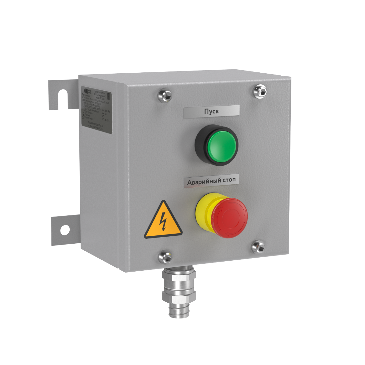 Бесплатно1-2 дняПост управления взрывозащищённый из конструкционной стали, с габаритами 180х180х125, с кнопочным элементом грибовидным поворотным 1NO/1NC (2BT-3/P3), с кнопочным элементом с самовозвратом зеленым 1NO/1NC (2BT-3/P1a2), с кабельным вводом под небронированный кабель в металлорукаве d=4-12мм, М20х1,5 - 1шт. (сторона В, снизу)