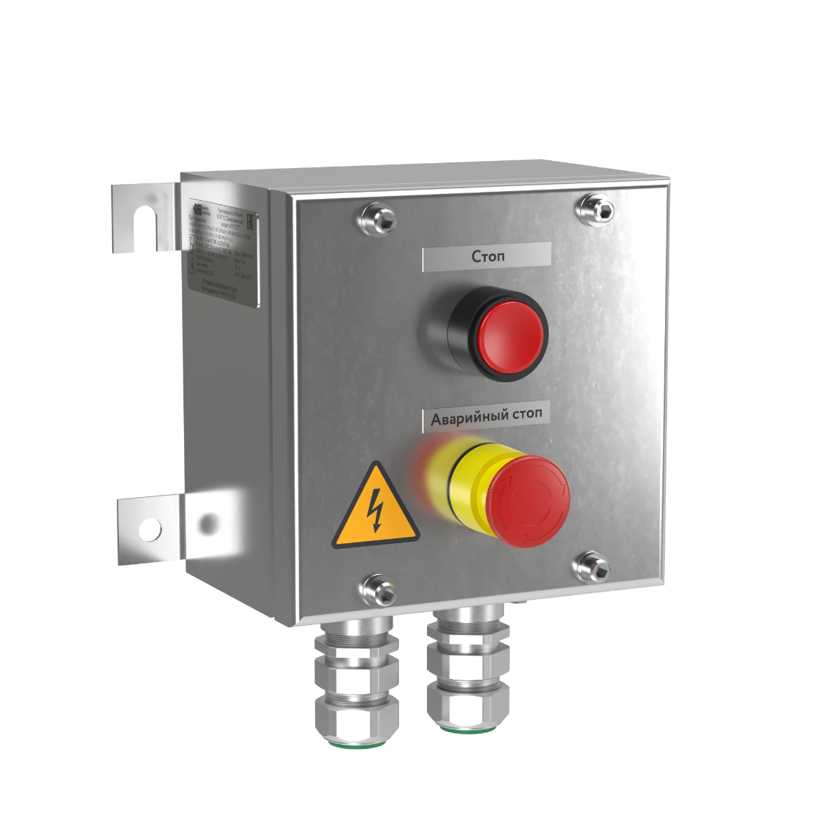 Бесплатно1-2 дняПост управления взрывозащищённый, в корпусе из нержавеющей стали Ех е-исполнения, с габаритами 180х180х125; с кнопочным элементом грибовидным поворотным 1NO/1NC (2BT-3/P3) - 1 шт.; с кнопочным элементом с самовозвратом красным 1NO/1NC (2BT-3/P1a1) - 1 шт.; на стороне В (снизу) с кабельными вводами под бронированный кабель d=6-12 мм, D=8,5-16 мм, М20х1,5 - 2 шт., материал вводов - никелированная латунь